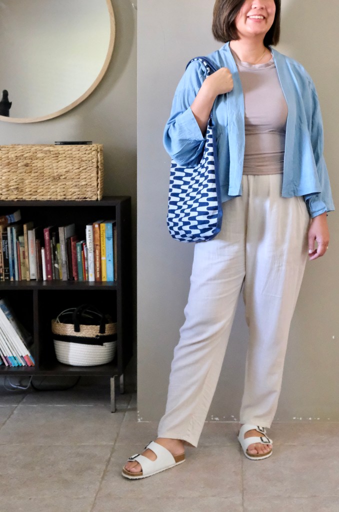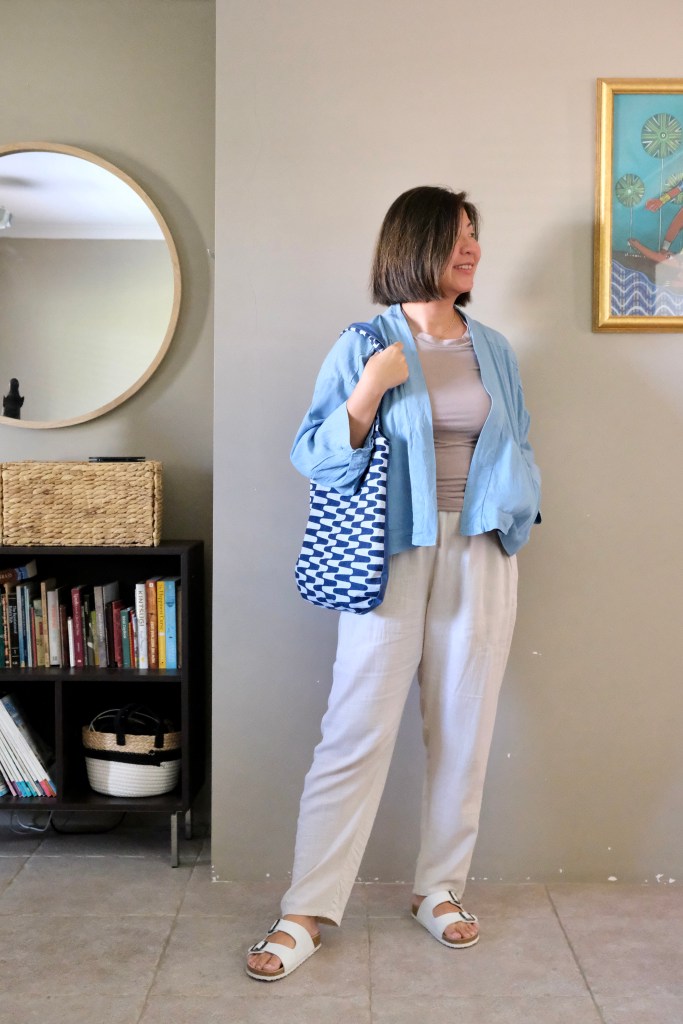 The Blomma Tank is a core piece for the wardrobe. Great for layering in winter and just so comfortable on its own in summer. I didn’t toile the pattern as other makers had commented that the sizing was quite accurate. My sizing of 35-inch high-bust, 37-inch bust, and 33-inch waist sat between the size E and F in the B Cup. I decided to sew size F without any modifications. It is a close-fitting top so there is negative ease in the stretch fabric. I’ve used a bamboo stretch jersey which is very soft. I hadn’t realised that I needed bias binding, so I used the same fabric which was ok.