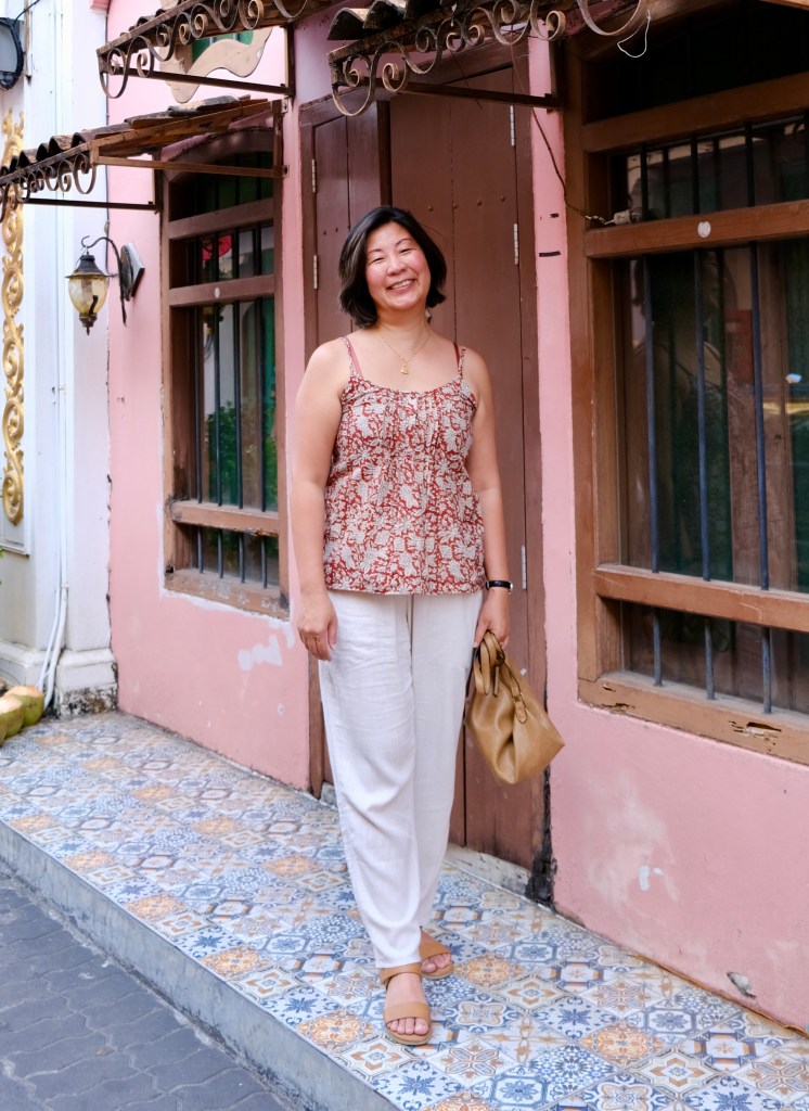 On the day that we went to Old Town Phuket, I wore my Sewhouse 7 Free Range Slacks with my Fabricstore Ash Cami. This was handy as there are a few temples that we visited in Old Town and we stayed until evening so my covered legs were kept safe from mosquitos. Old Town is filled with interesting Sino-Portugese architecture and reminds me of Malacca and Penang. It’s worth a look, I just wished we had timed our visit with the Sunday Markets which are famous as two streets are closed off for the stalls and food carts.