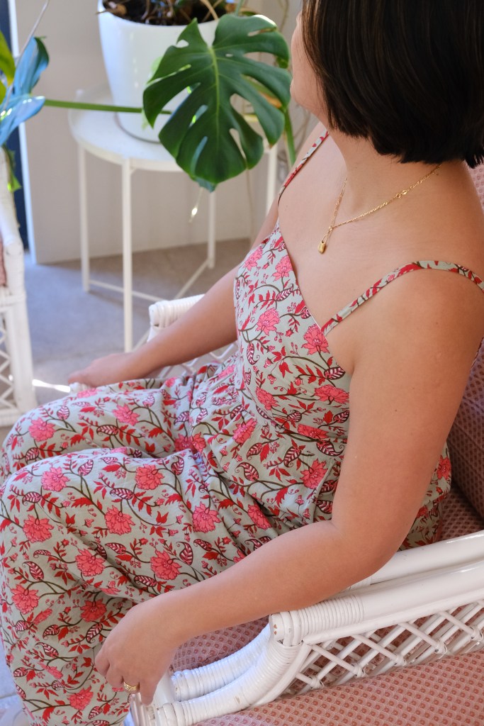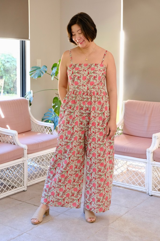 This hand stamped floral block print was a dream to work with. It’s very stable to sew and easy to handle. I used an overlocker to finish the seams which worked fine. Some finer fabric would need French seams, but the cambric cotton tolerated the overlocking. True Bias instructions and order of construction is excellent. It was a joy to bring together this pattern and the fabric. I just need a bit of sunshine and heat to wear it. Is it okay to book a tropical getaway so you can wear an outfit? Asking for a friend.