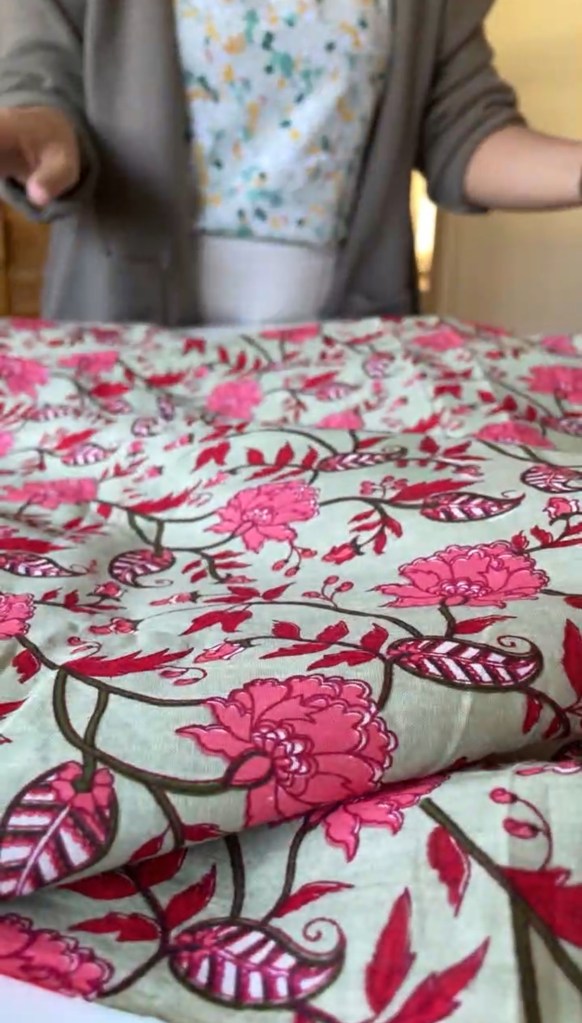 It was so exciting to receive this beautiful hand-blocked cambric cotton from Fibers to Fabric for a review. The first thing I had to find out was, what was cambric cotton? It’s sometimes known as batiste and it’s a beautifully sheer fabric that’s great for summer. It reminds me of the handkerchiefs my grandmother used to hand embroider. It’s a natural fabric and usually made from either linen or in this case, cotton. It’s popular because it can be dyed easily so it’s perfect for the Fibers to Fabric hand-block.
