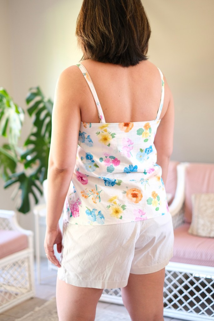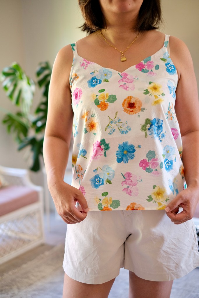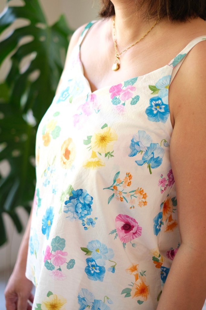 I was so happy to match the pattern to a beautiful piece of fabric that I had received from Devonstone Fashion. It’s a Liberty Tana Lawn named Mrs Gardener. The print shows brightly detailed flowers on an off-white backdrop. There was a recent showcase by Regent Street Fabrics and Two Green Zebras in Brisbane and Melbourne showing some beautiful Liberty fabrics. So many beautiful prints. It looked like such an inspiring event with all the outfits showcased on the catwalk. I was gifted 600 cm of this fabric but with the 130cm wide width, it was easily enough for this Cami top.