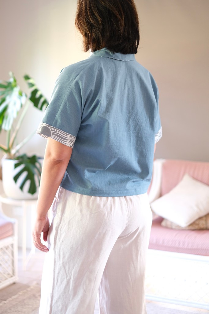 Version B has short sleeves attached and I chose to use the contrast fabric for the yoke and sleeve facings showing on the right side. I think the contrast also helped to highlight the shawl collar. The lightweight linen worked well, and this time doesn’t feel like I’m wearing a scrub top. This is my favourite version of the top.