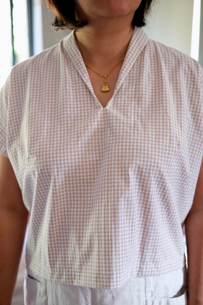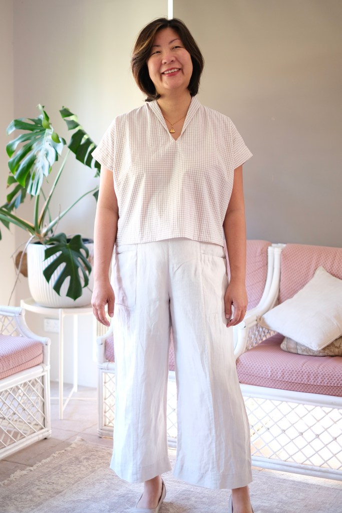 For my measurements of 38-inch bust and 33-inch waist, I made the size 12. I based my sizing on my bust measurements. My waist sizing falls into size 14 but looking at the ease, I felt that the size 12 would fit my frame better. The topper length is cropped but can still be tucked into high-waisted pants or skirts.