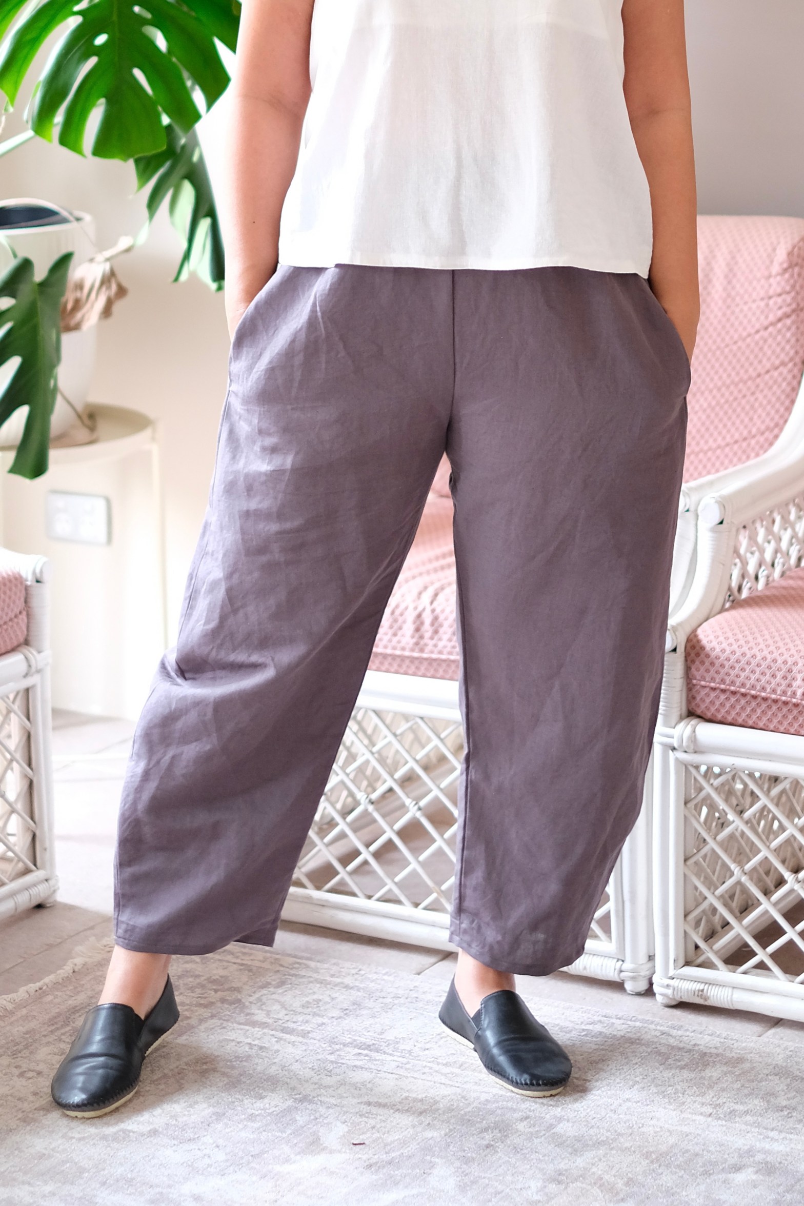 The pattern is for woven fabric, so I went to my local Spotlight to have a look. With great luck, I found the linen-cotton blend on sale! I nabbed a bargain and perhaps a few other meters of fabric fell into my shopping cart. The grey slate cotton-linen is a medium weight perfect for the pants. I wanted something sturdy to try emphasising the barrel shape. I thought, if I’m trying the barrel shape, I really want to see what it looks like. Better to test out from the outset whether this style suits me or not.