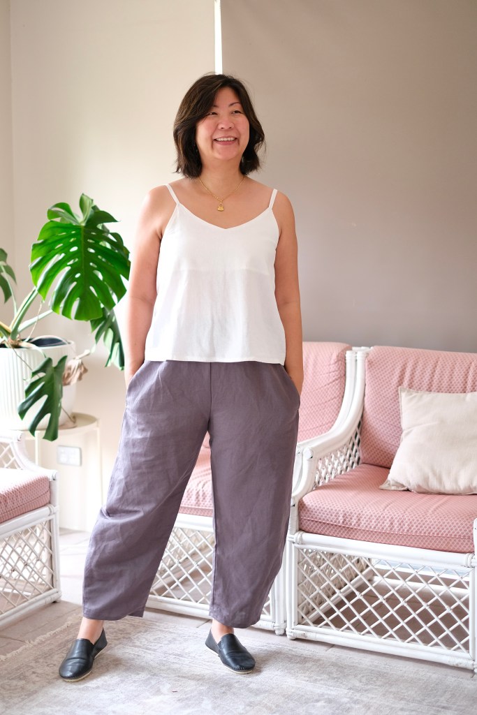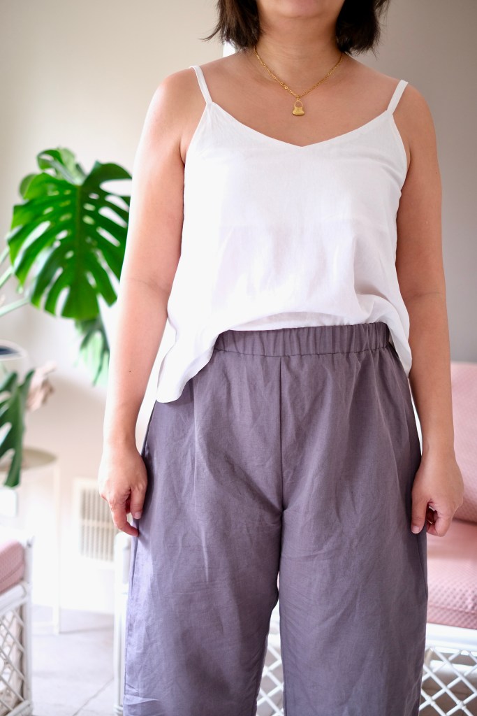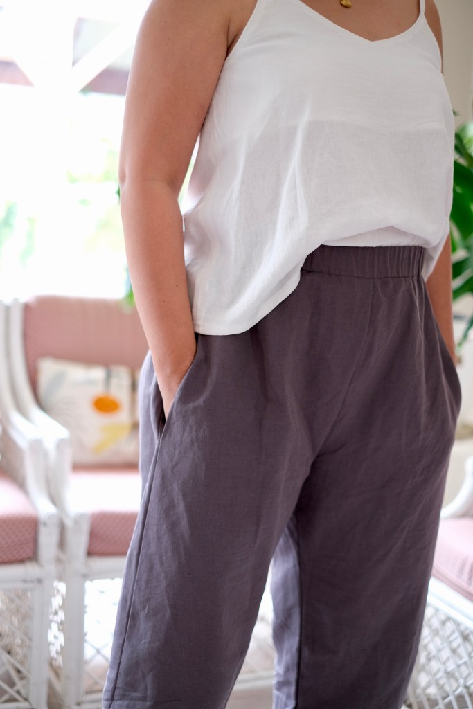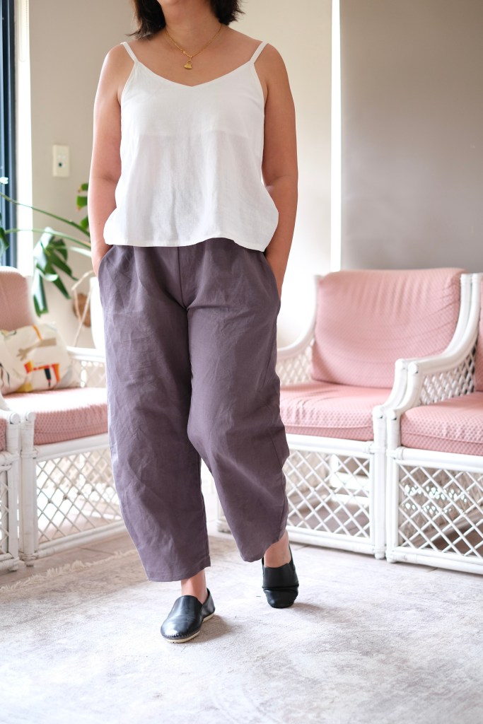 This has been one of those patterns circulating in the sewing community, so I’ve been curious to try it. I’m so happy that I did because I immediately feel like making another pair. The Style Arc Bob Woven Pants are a barrel shaped pair of casual pants with side seam pockets and elasticated waistband.