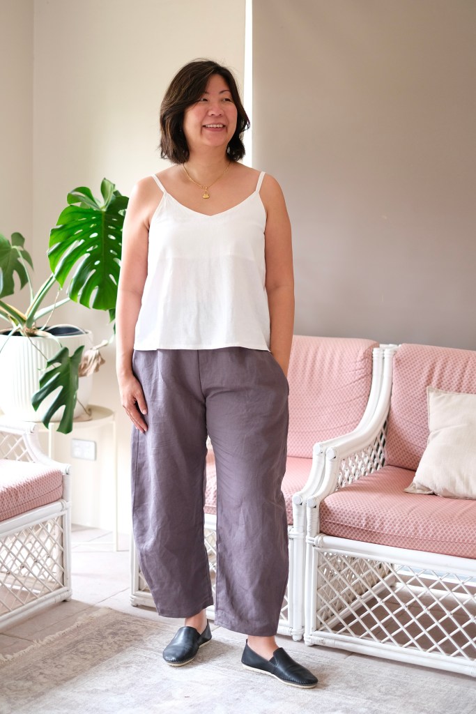 The Bob pants ( trousers) look great! The linen suits them. I think barrel legs are really nice for curvy or hourglass figures, of which I am one, as they provide room for hip movement, which more restrictive jean types don’t.