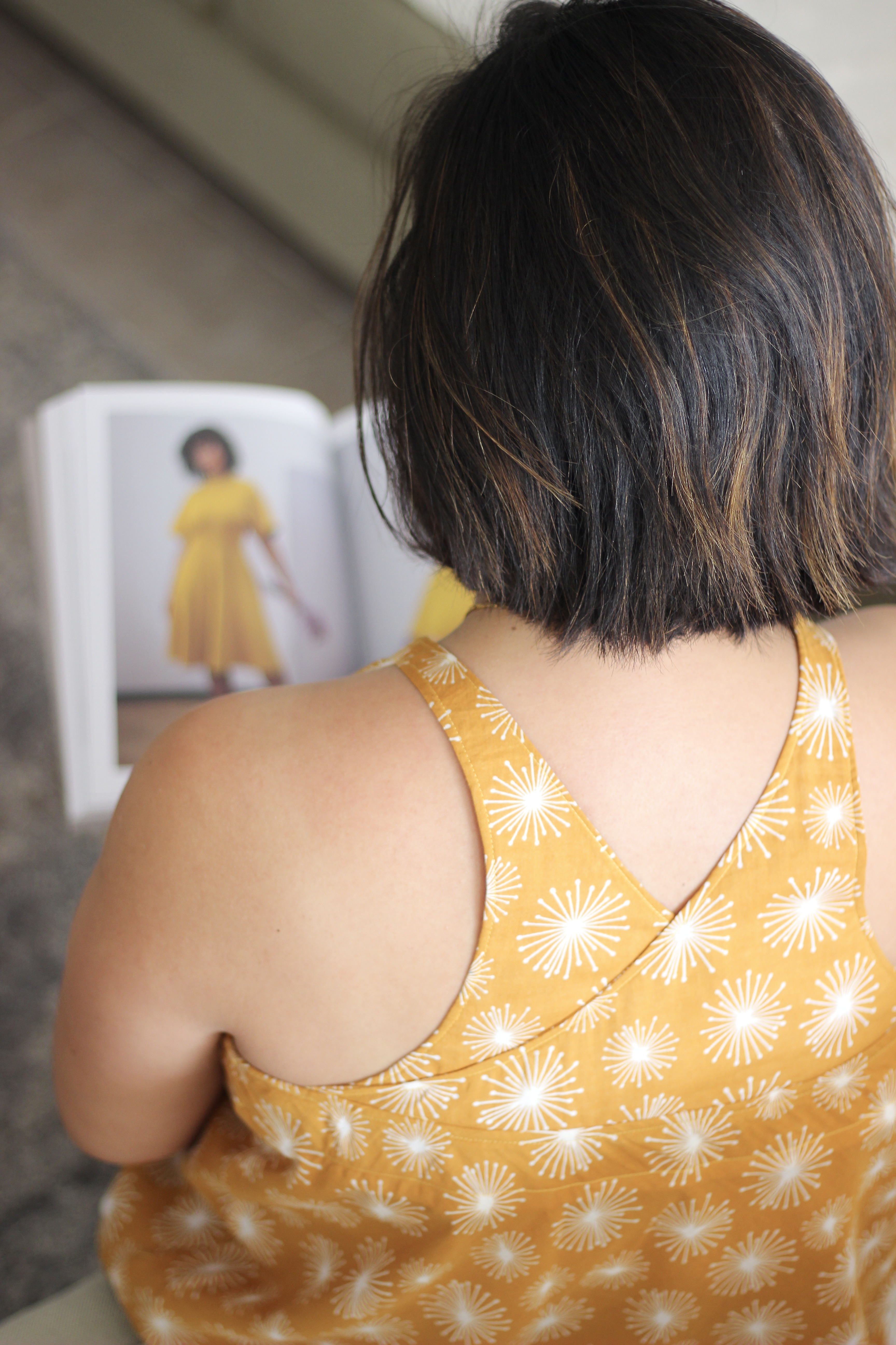 I made the size 4 but I think you’ll find the fitting very easy on this. The drawstrings can be adjusted for a broader or narrower back. It’s quite ingenious engineering. There were no modifications made. After many wears, the hemline may have dropped in the back of my dress. I was impatient to finish and wear the dress and so I’ll have to trim and resew the dropped hemline.