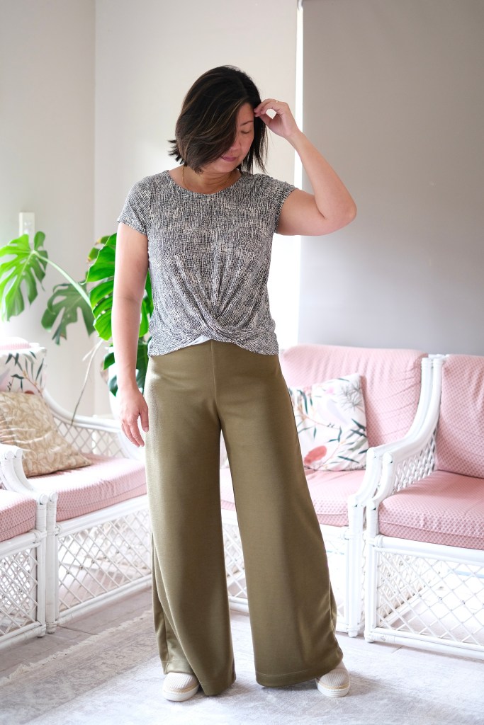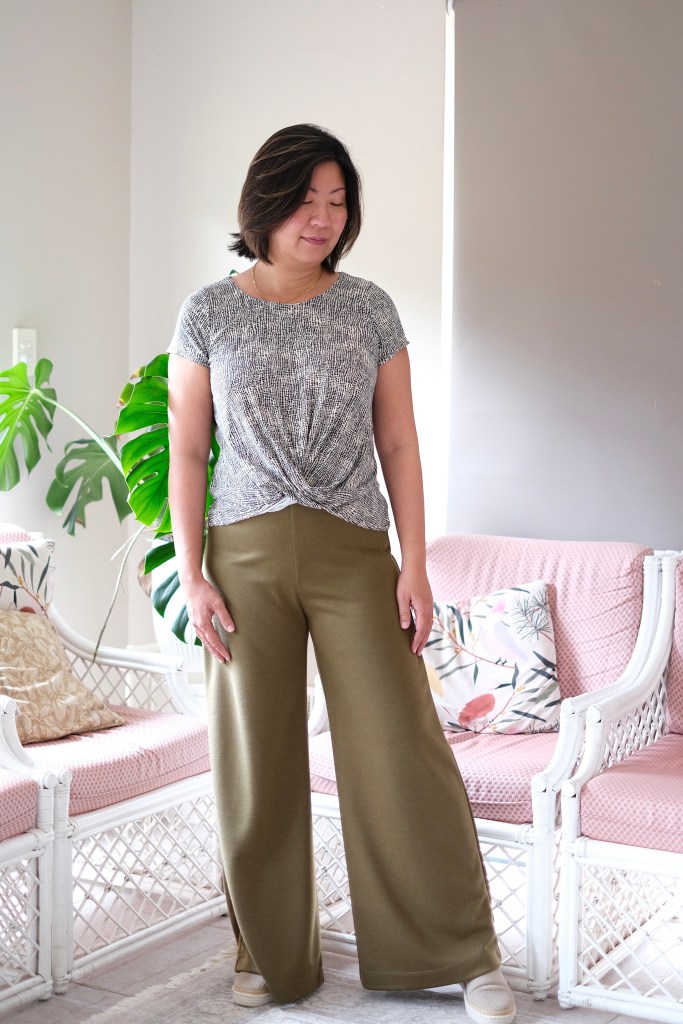 The Ayla Pants are wide leg, pull-on knit pants. There are two views, and I chose to sew View A which does not have the seam down the front and back leg pieces that View B has. It’s a very quick sew because there are only two pattern pieces and the waistband folds down from those pieces.