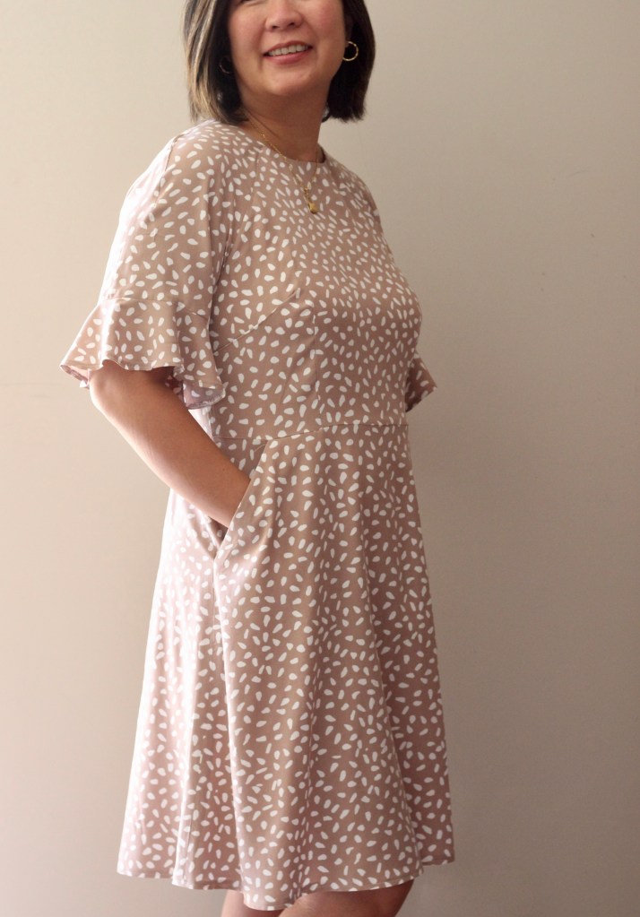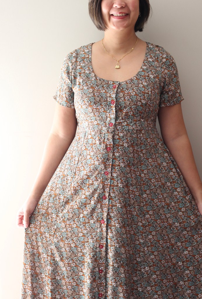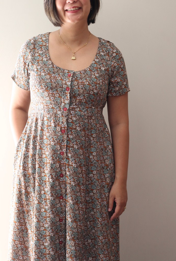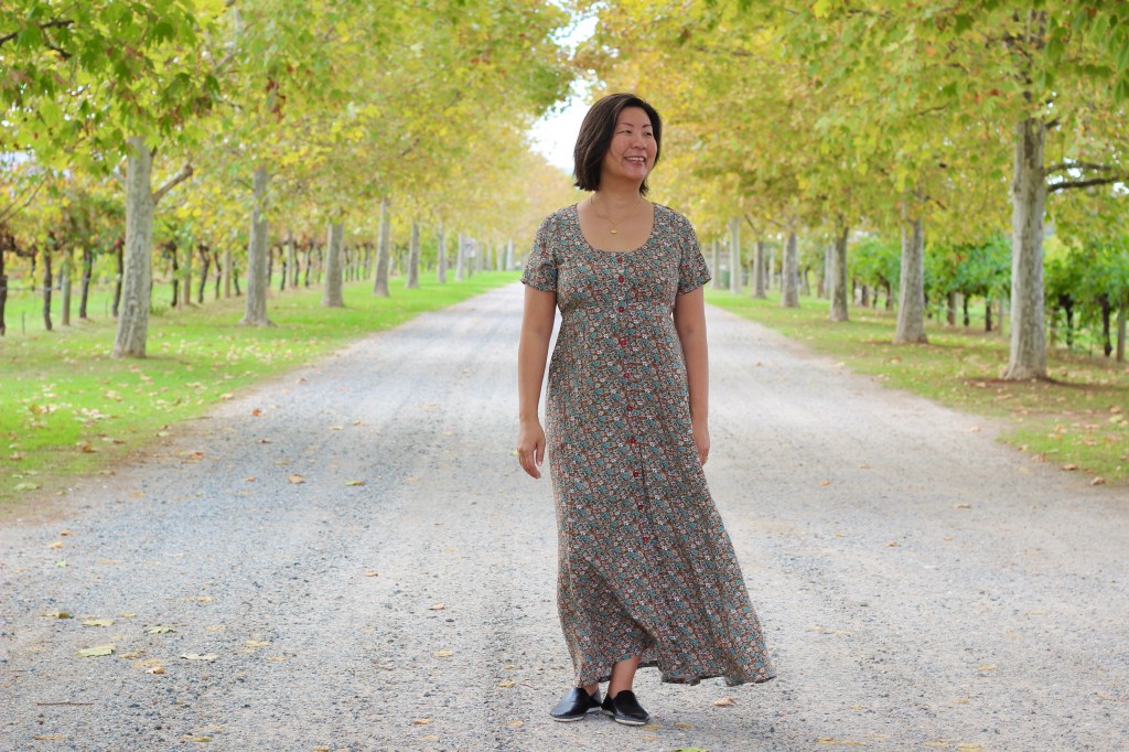 The bohemian style of the Milla Dress from Slow Morning Studios caught my eye with the interestingly lined bodice panel surrounded by gathered sleeves and skirt pieces. It’s honestly the biggest sleeves I’ve ever sewn. This is a pull-over-your-head dress, so no zips or buttons needed. I’ve used the beautiful floral liberty-style cotton lawn sent to me by DIY District and I’m so happy with the combination. The cotton lawn is a non-stretch lightweight woven which suits this pattern. In fact, with the size of those sleeves and the amount of gathering, I would choose an even lighter fabric next time but for this make, I’m love the vintage vibes with this lovely liberty design.