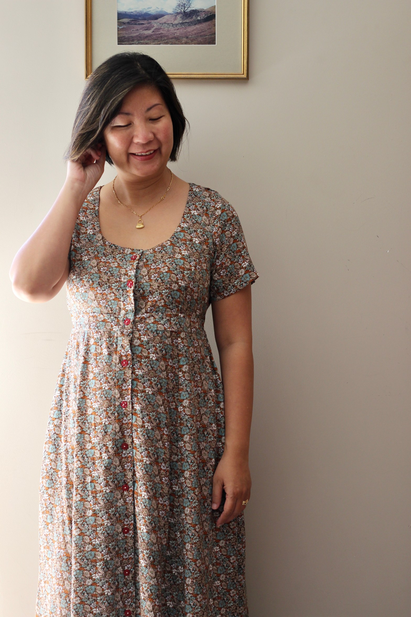 The bohemian style of the Milla Dress from Slow Morning Studios caught my eye with the interestingly lined bodice panel surrounded by gathered sleeves and skirt pieces. It’s honestly the biggest sleeves I’ve ever sewn. This is a pull-over-your-head dress, so no zips or buttons needed. I’ve used the beautiful floral liberty-style cotton lawn sent to me by DIY District and I’m so happy with the combination. The cotton lawn is a non-stretch lightweight woven which suits this pattern. In fact, with the size of those sleeves and the amount of gathering, I would choose an even lighter fabric next time but for this make, I’m love the vintage vibes with this lovely liberty design.