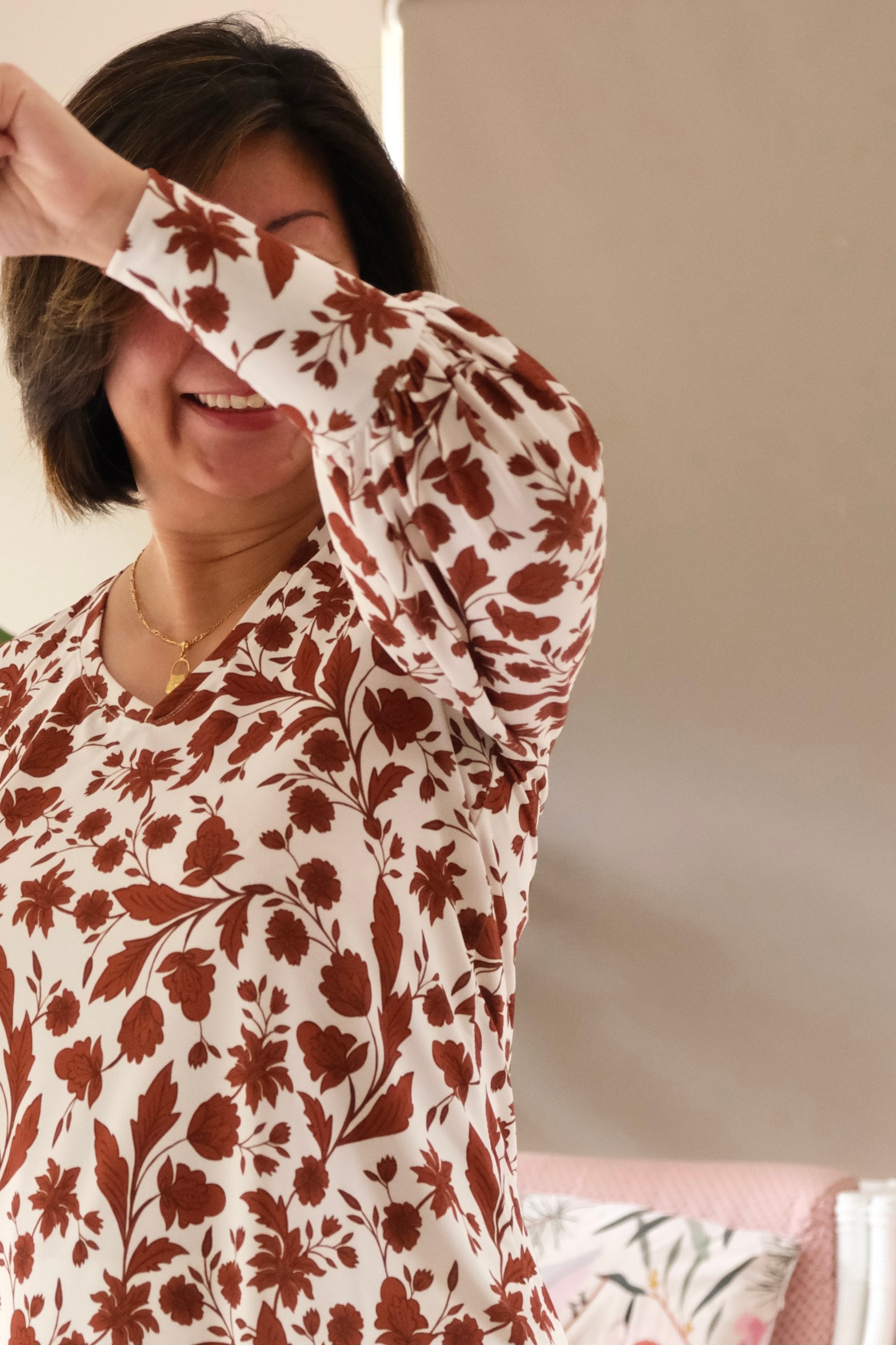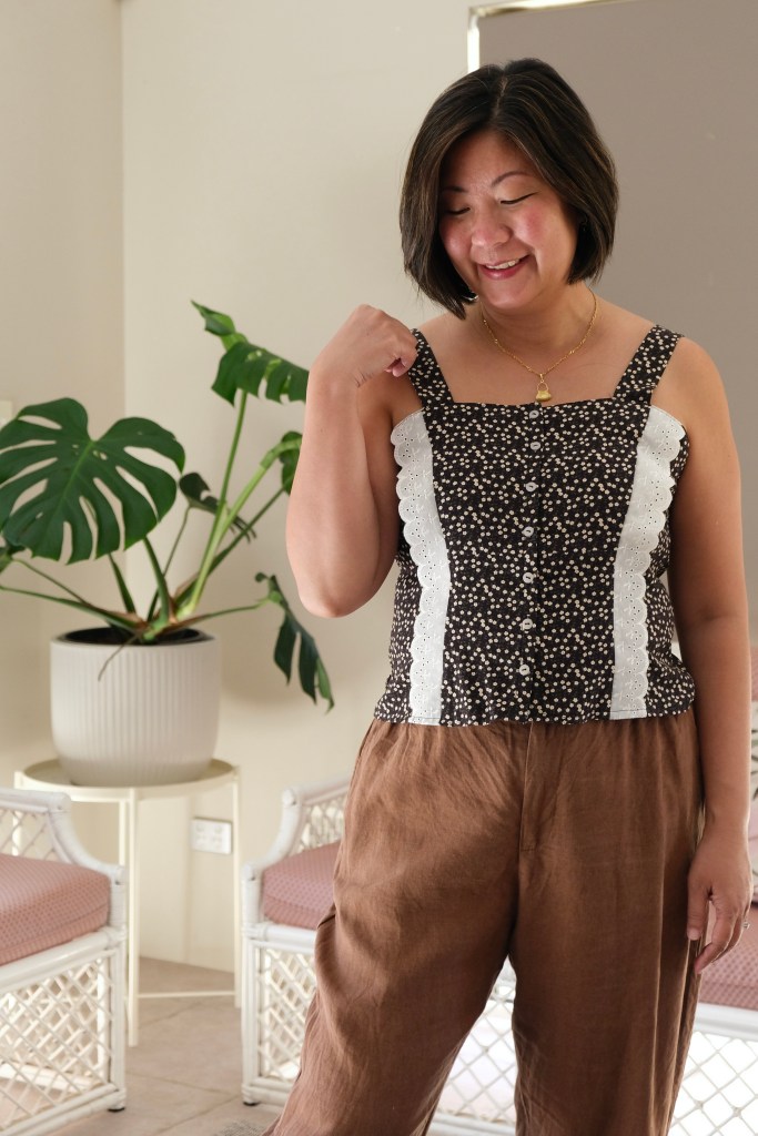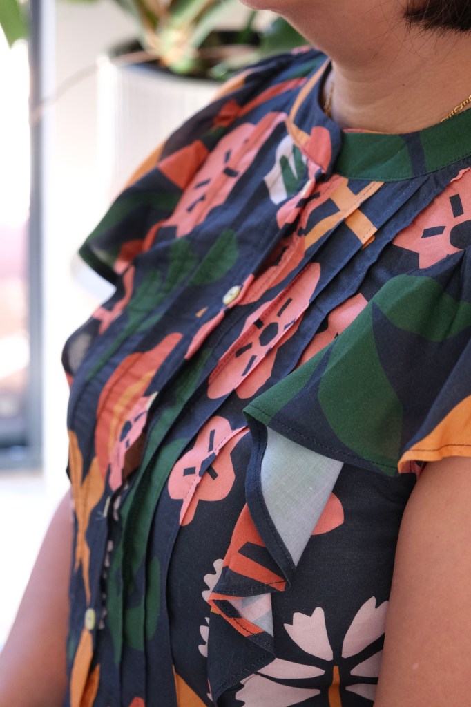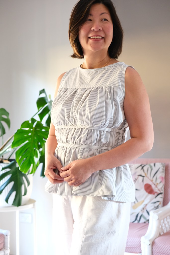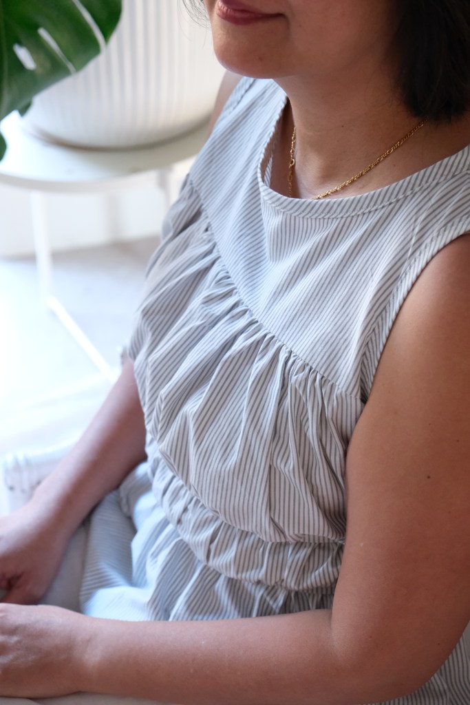 For the Size L, I used less than 1 meter of fabric. I chose the L from my bust measurement of 38 inches. It’s a very beginner friendly pattern for sizing because there is such a range and ease in the pattern. I really love how the shape is given by stitching and shirring. Speaking of shirring, I had almost forgotten how to do it. Sara does explain it very well in the pattern, but I find that my machine is always the exception when it comes to these things. I tested on a scrap piece of fabric, but it didn’t work. I found that for my machine, I had to wind the shirring elastic onto the bobbin with a bit of tension, and I had to turn up my machine tension. I also followed the instructions in increasing my stitch length. The main thing is to test before starting on the real piece.