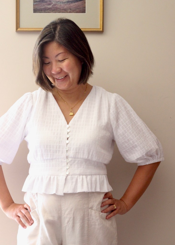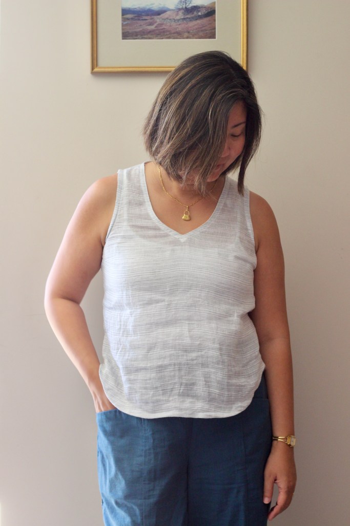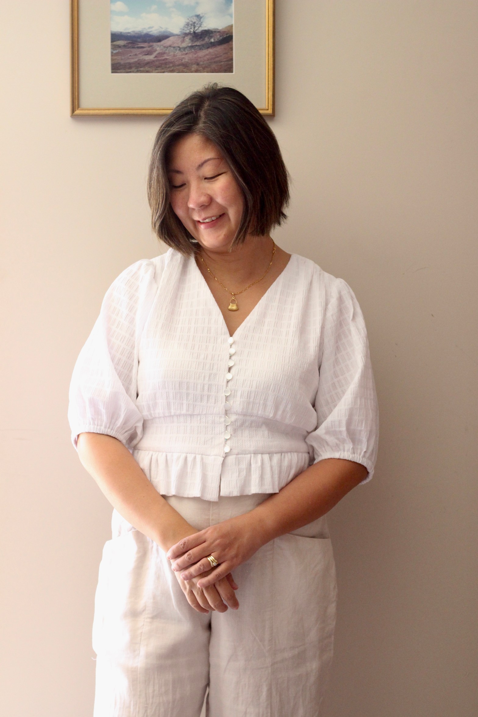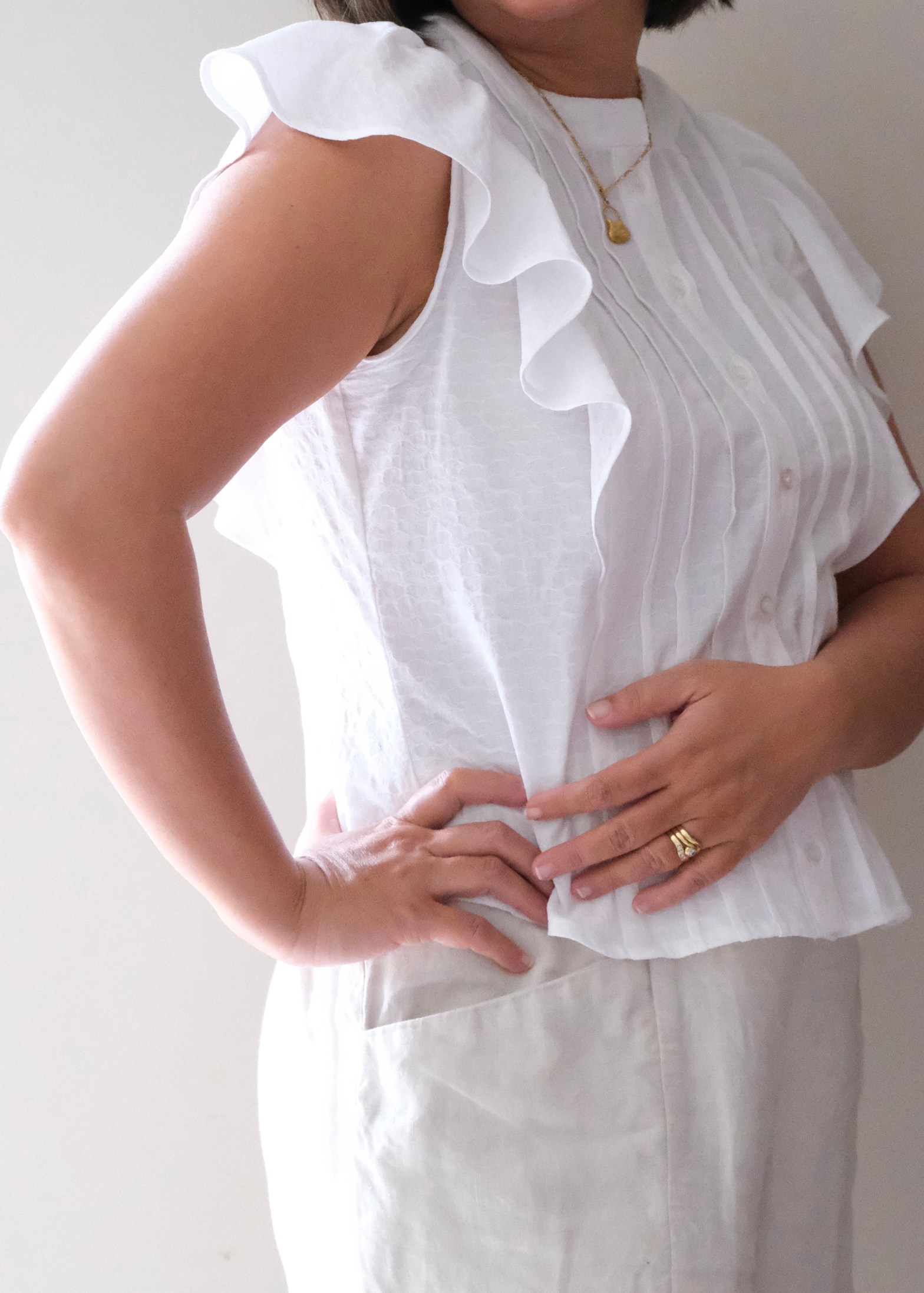 This top is made for lightweight woven fabrics. I’ve used a textured white cotton voile. This is an addition to my tropical getaway capsule which I’m counting down to with the cold weather now setting in! The fabric is slightly sheer and very breathable so it’s great for humid weather.