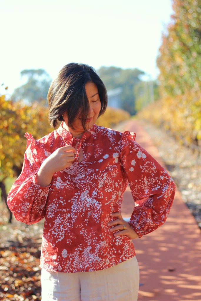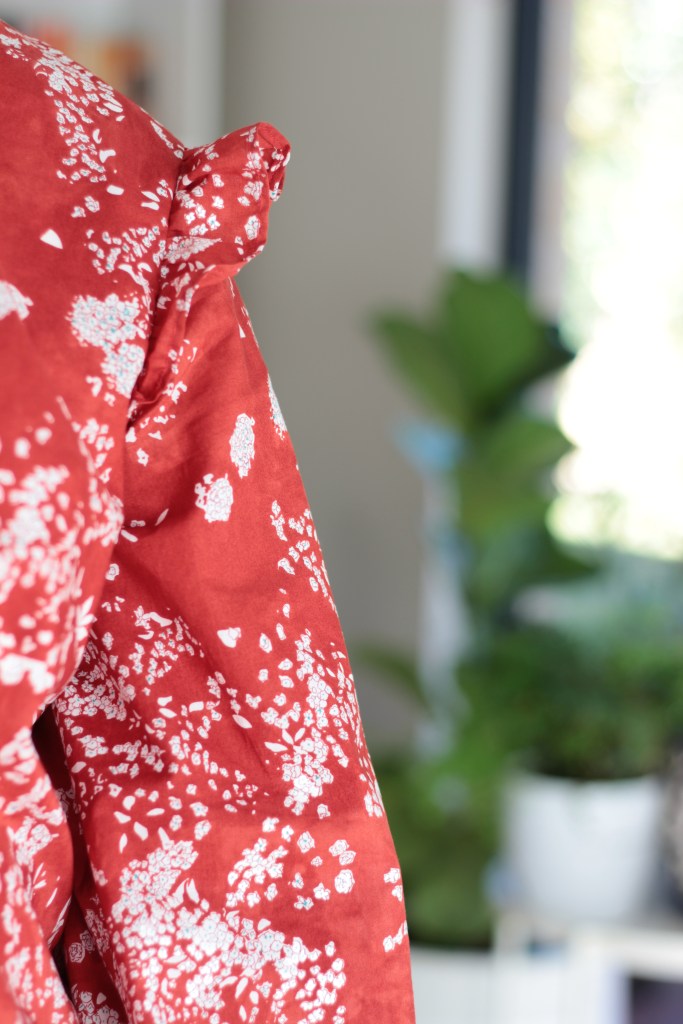 The Helmi Blouse requires about 2.6m/2.9yards of a fabric measuring 114cm/44inch in width. Now, here, it’s important to take note that the Nani IRO Lei Nani Organic Cotton Lawn Red has quite a wide selvedge which means that the pattern measured only 99cm which is narrower than the 110cm mentioned in the description. Luckily, I was sent enough of this gorgeous fabric with a bit to spare.