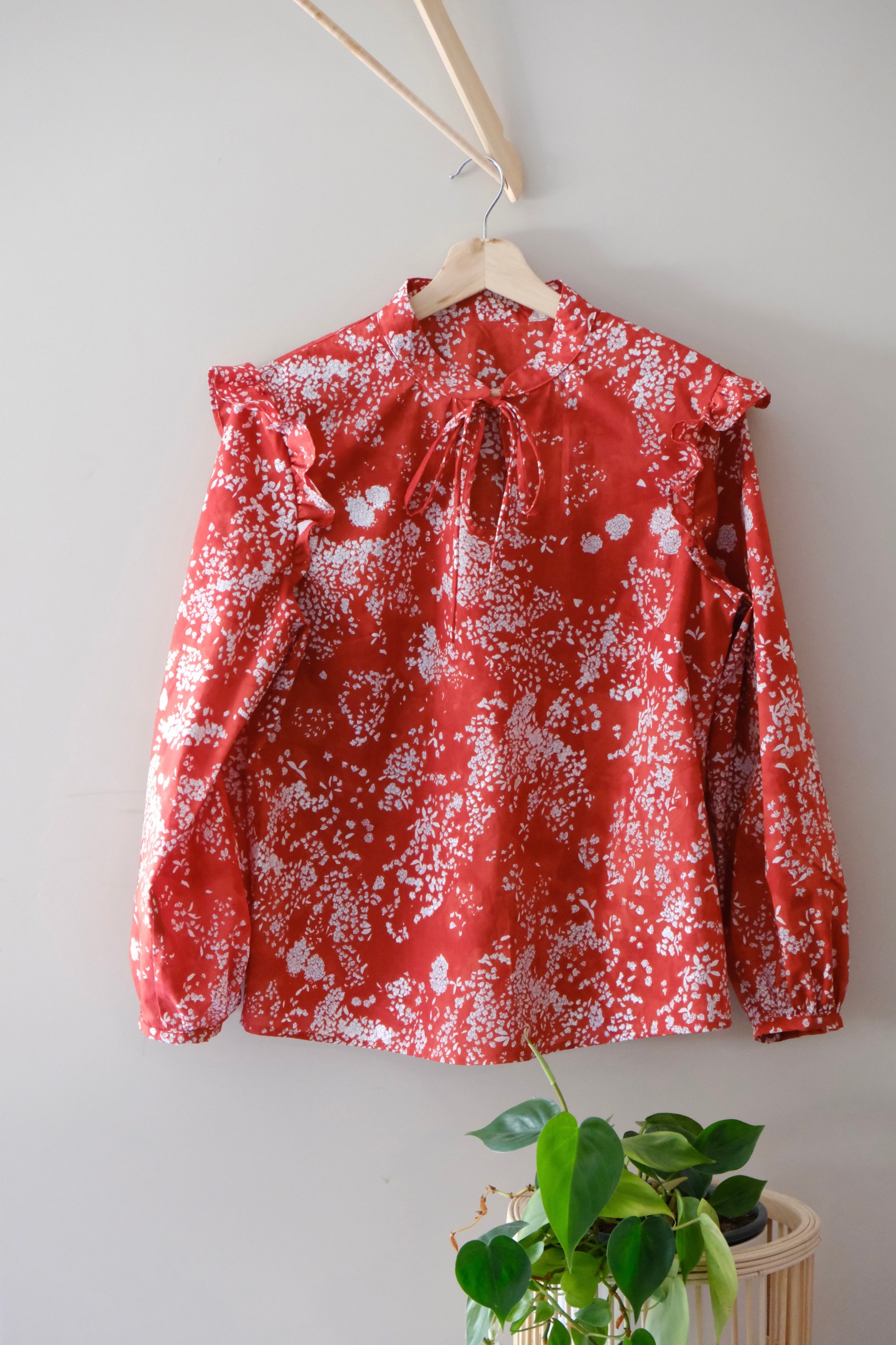 When Diep from DIY District Fabric reached out regarding their online fabric store based in Kyoto, Japan, it was hard to choose only a few pieces with the wide selection of high-quality premium fabrics on offer. This beautiful Nani IRO Lei Nani Organic Cotton fabric in red was kindly gifted from DIY District in exchange for an honest review. It is made from one hundred percent organic cotton and is beautifully sheer and lightweight being around 100gsm (3.5oz) which made it perfect for another Helmi Blouse. I was drawn to the vibrant red of this cotton lawn. The fabric reminds me of a watercolour painting with a red background and a random distribution of blossoms in white and a hint of shimmery silver through the blossoms.