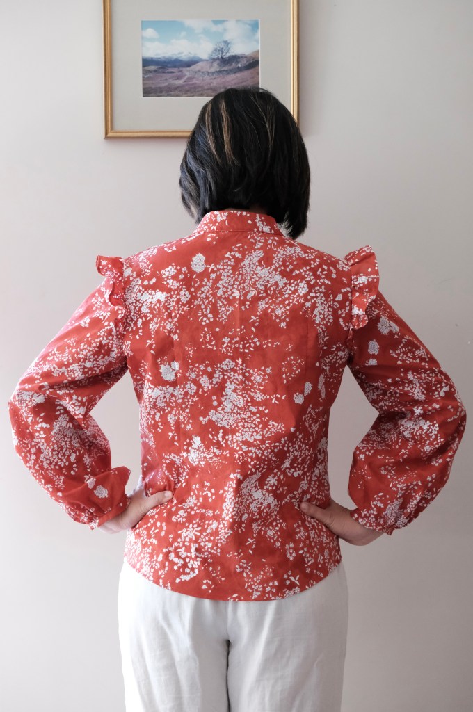 I had made the peter pan collar version with ¾ sleeves previously in a lightweight muslin fabric. This time I’m sewing the full sleeved version featuring ruffles along the shoulder seams and a stand collar. I thought I would focus my blog on sewing with this lovely fabric.