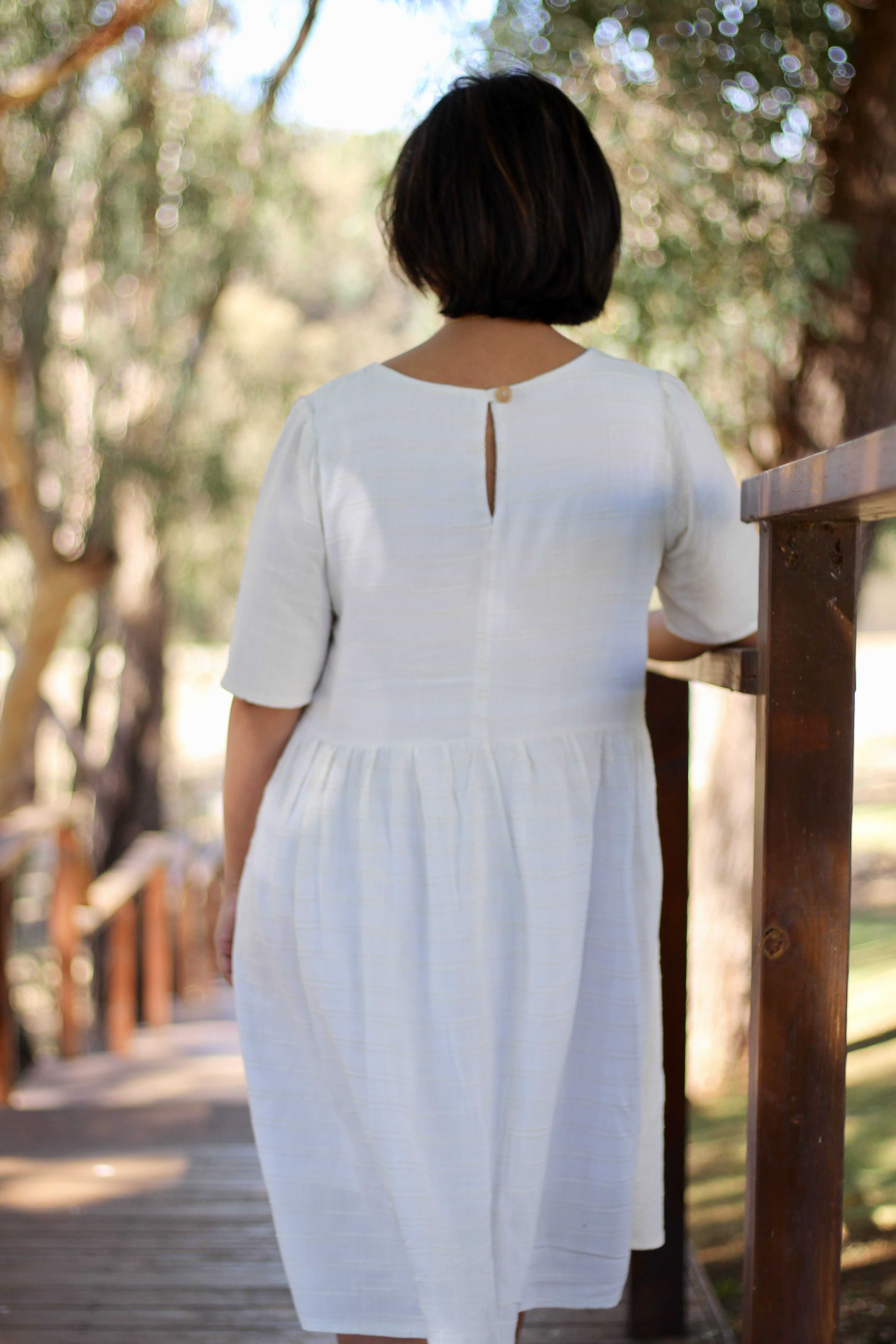 There are so many positives of the pattern. I’m often pulling up straps with my sloping shoulders so I’m always trying to modify straps to sit on my shoulders. Well, I think I’ve found the perfect strap design because I haven’t had to worry about that with my Arcadia Dress. My straps on the sleeveless version stay put because the straps join onto the neckline with a long length of bias binding, and they seem to sit perfectly without any chance or length for them to slip off the shoulder.