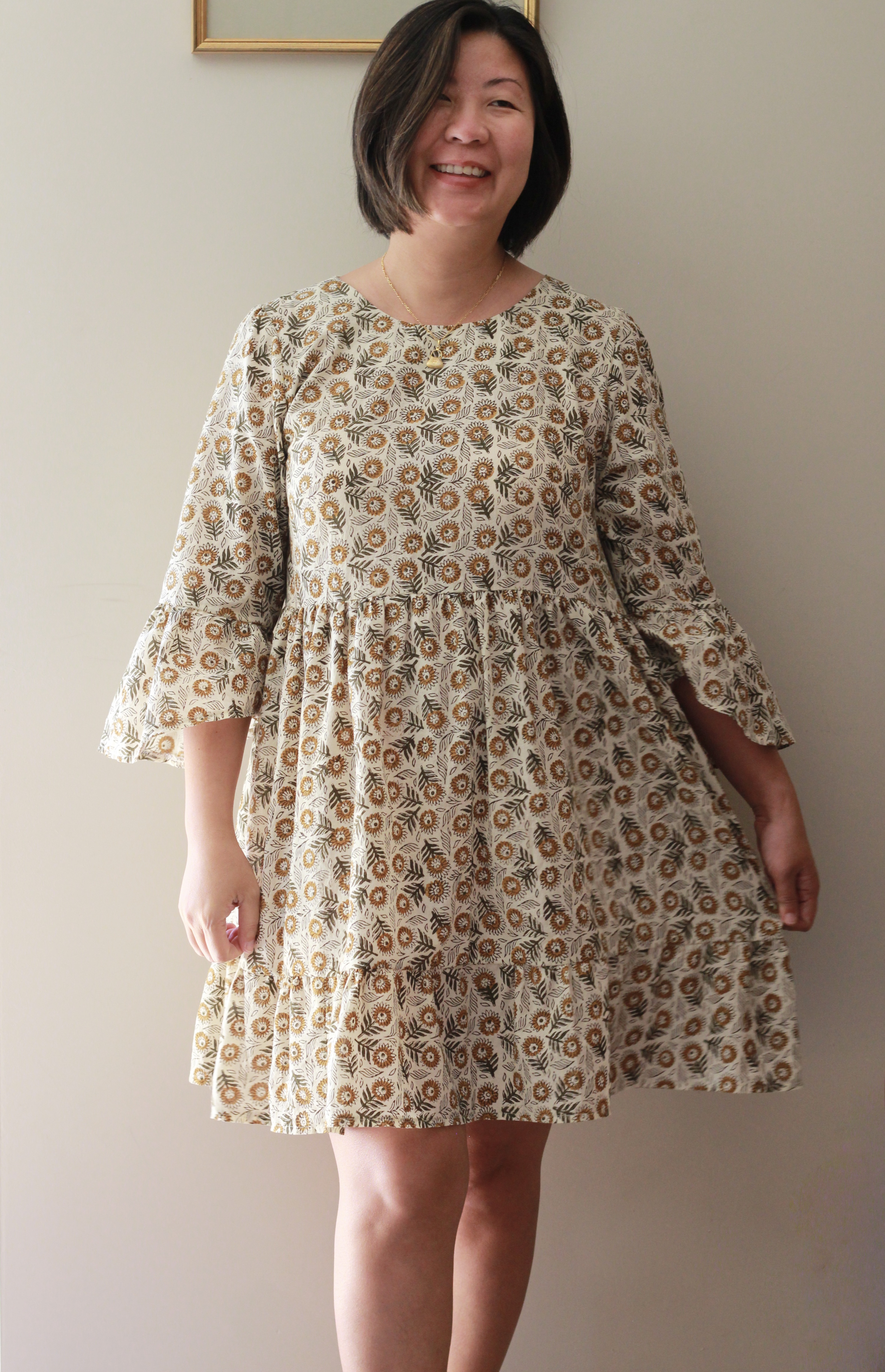I sometimes find tiered dresses to be very oversized and worry about swimming in volumes of fabric, but the Arcadia Dress is sized to fit in a flattering way. My measurements of 38-inch bust, 33-inch waist and 40-inch hips fit into the size 12 and I found the pattern true to size. No modifications were made except for my maxi version. To achieve the maxi length, I doubled the width of the bottom tier.
