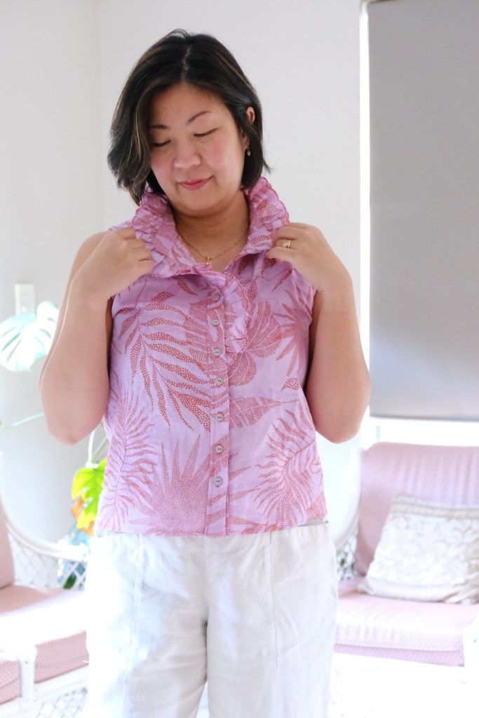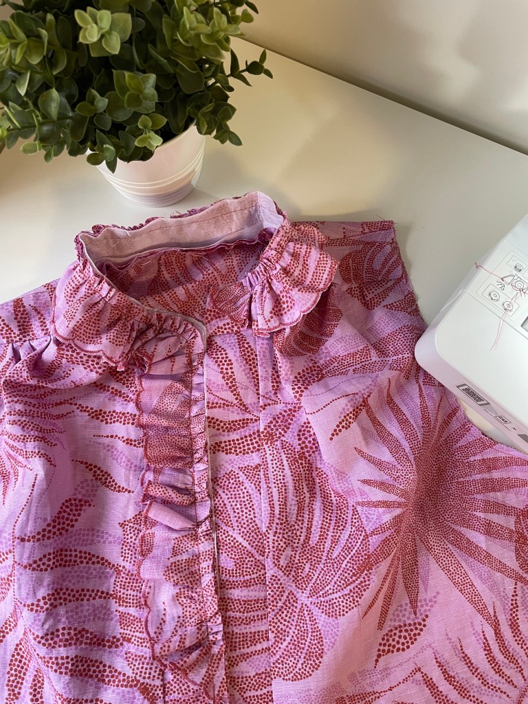 One part that I enjoyed the most but also the part I sewed wrongly in the first toiled version was the ruffles. It doesn’t state in the pattern which side (right or wrong) of the fabric to cut on and it’s not possible to tell on the video with the fabric being used. So, initially, I cut from the good side of the fabric, and it meant that my longer side of the ruffle ended up on the left side of the blouse. Women’s shirts button from right to left, that is, buttonholes on the right and buttons on the left. So, on my toiled top, the buttonholes are on the left with the ruffles and the buttons on the right. It still works but it was something I had to pay attention to in the linen version. This time, I cut the pattern pieces from the wrong side of the fabric, and it worked out fine. This mistake was not a reflection on the pattern but just me forgetting which way women’s tops button up. Who decided this in the first place anyway?